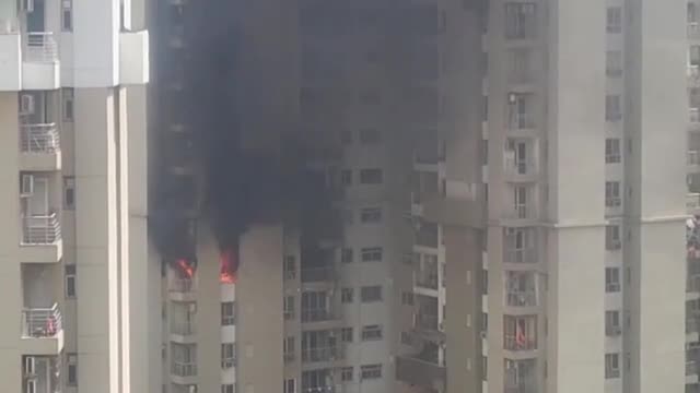 Footage shows the inferno, reportedly caused by an air conditioner explosion, ripping through the 10th floor of the high-rise building in the Lotus Boulevard Society in Noida, Uttar Pradesh, on May 30.