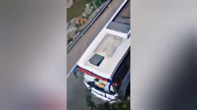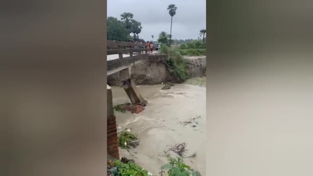 Four cement girders placed between pillars 17 and 18 collapsed due to heavy winds and the strength of the currents, marking the second time the bridge has fallen down in Peddapalli, Telangana, India, on July 2.