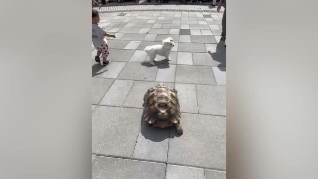 Tortoise chases pet dog at the park