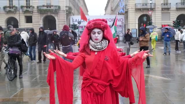 Dressed in red as they walked quietly through the Piazza Castello, the 'Red Rebels' from the group Extinction Rebellion protested against 'unsustainable mobility' and car companies profiting from the Israel-Palestine conflict. 2025-09-28 09:15:31