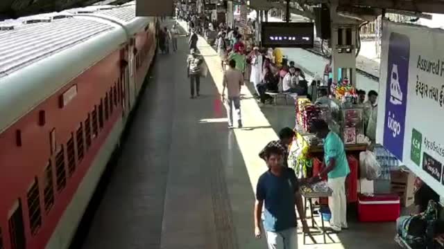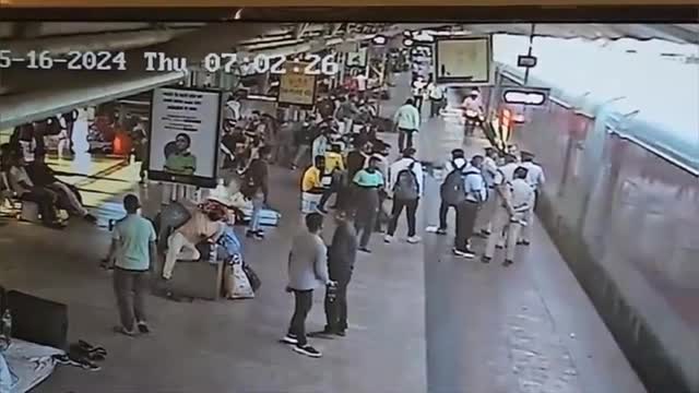 CCTV footage shows the Railway Protection Force officer running after the female passenger who was trying to chase the open door of Marusagar Express at the Surat Railway Station in Gujarat on May 14. 2024-05-17 17:40:03