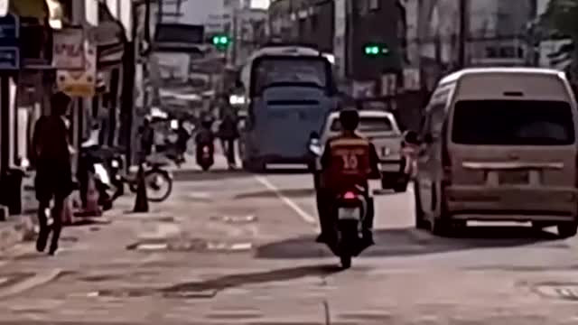 Footage shows the bus straying out of its lane and nudging the cyclist, causing him to slam into the road near a school in