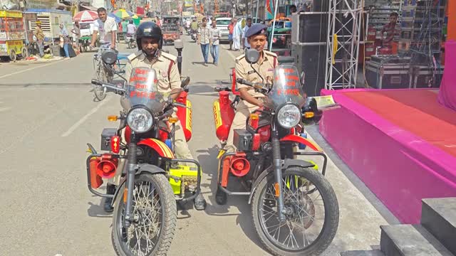Three officials aboard a bike equipped with firefighting equipment were seen standing by the street during an event in Patna, Bihar, on April 11. 2024-05-13 22:00:56