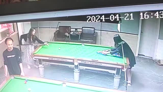 Ms Zhang spotted two girls playing billiards when one of the players teed off the ball and hit her friend in Yiyang, Hunan, China, on April 21. 2024-05-13 21:40:19