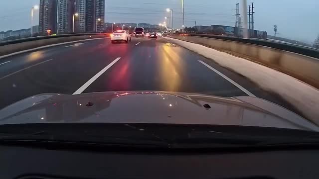 Dashcam footage from driver Wang Weini shows a van skidding on an icy road, leading the car on its right to bump into the roadside barrier. 2024-05-12 13:13:49