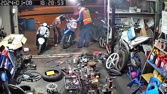 CCTV footage shows the two motorbike taxi riders inspecting the two-wheeler in front of the shop with one of them tinkering the throttle in Ayutthaya province, Thailand on January 8. 2024-05-12 13:08:34