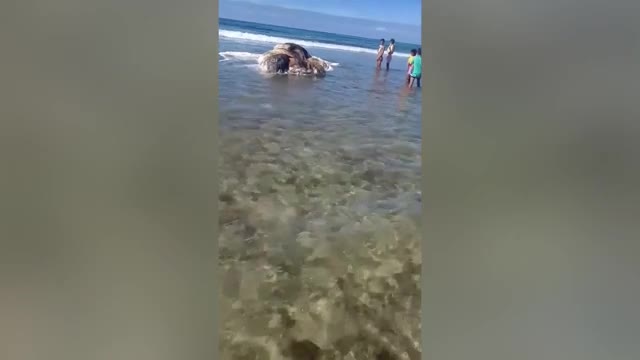 Footage shows the blubber floating in the shallow part of the water and being pushed by waves to the shore in Siargao Island, the Philippines, on April 25. 2024-05-11 10:23:47