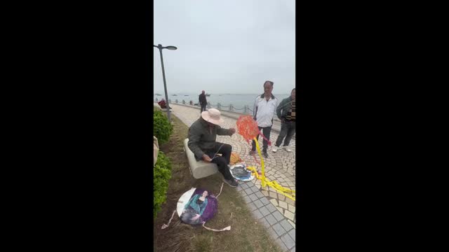 An elderly man gracefully flies a kite made from dozens of garbage bag, showcasing his creativity and wisdom by turning waste into something beautiful on February 28, 2024, in Guangdong.