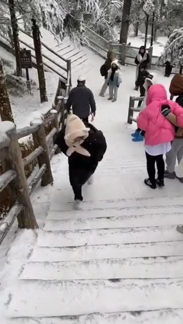 Footage shows the youngster climbing up the snow-covered staircase before laying on her side so she could slide down in Sichuan province's Mount Emei in China. 2024-05-08 22:40:46