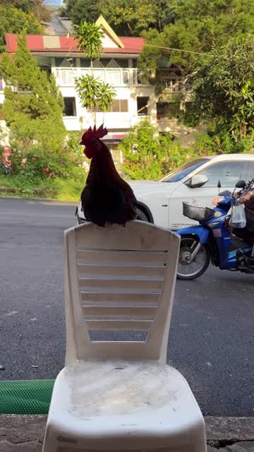 Footage shows the rooster sitting on the top rail of the plastic Monoblock, briefly flapping its wings every time a passerby wanders past in Chiang Mai, Thailand. 2026-01-06 14:16:56