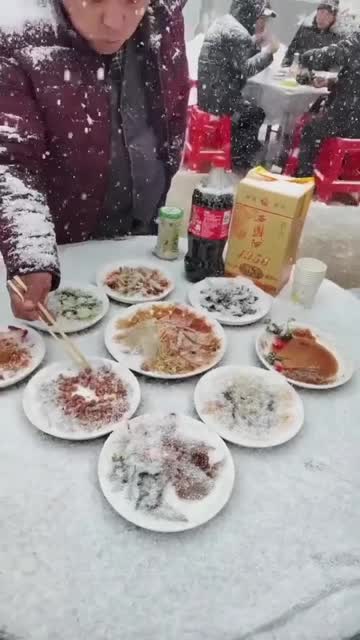 Footage shows the residents eating their feast of traditional dishes from plastic chairs and tables arranged on the street during cold weather in Shaanxi province on January 21.