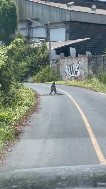 Wild monitor lizards wrestle on road