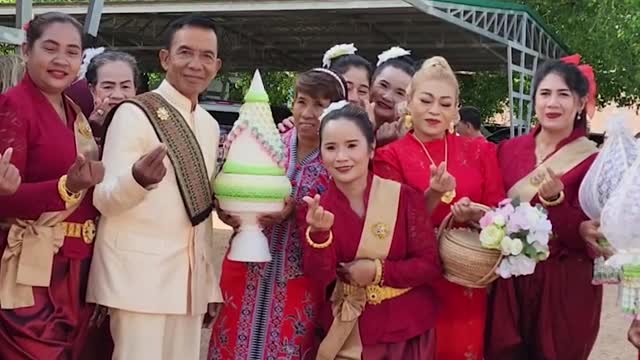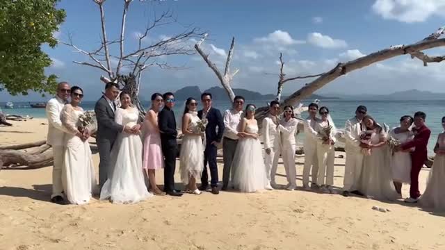 Twelve pairs of newlyweds - one Chinese, one Malaysian couple, one Indonesian couple, and nine Thai couples - plunged into the beautiful turquoise waters of the Andaman Sea to tie the knot in an annual group wedding ceremony in the southern province of Trang on February 14.