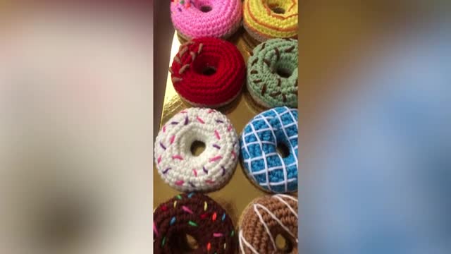 Housewife different-coloured makes crochet donuts