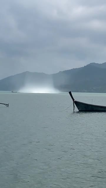 Footage shows the white mist rising from the surface of the sea until it the column was visibly connected to the clouds above while engulfing two empty vessels in Phang Nga province, Thailand on April 28. 2024-05-01 19:26:50