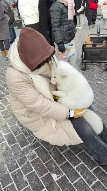 Footage shows the woman wearing thick winter clothing embracing a clingy white fox on her lap in Heilongjiang province on January 23.