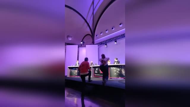 Footage shows two people from climate activist group Riposte Alimentaire walking up on the platform, disrupting the European Forum on Bioethics on February 8.