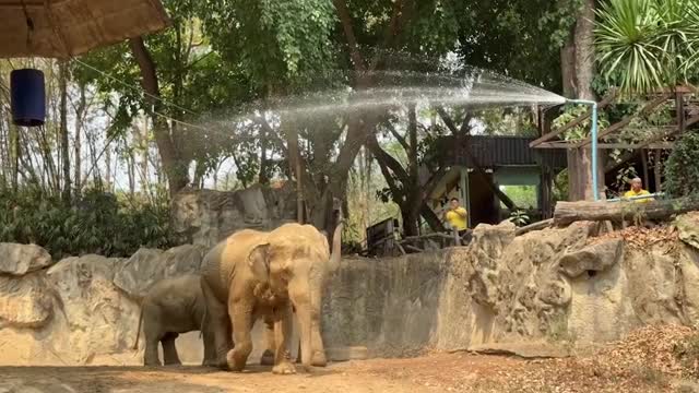 Footage shows the sweltering pachyderms enjoying a shower under a sprinkler as the mercury topped 40 degrees Celsius at the Chiang Mai Zoo on April 29. 2024-04-30 14:26:21