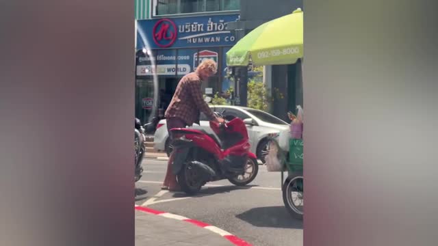 Footage shows the holidaymaker using bolt cutters to remove the lock from a motorcycle without a license plate in Phuket on April 26. 2024-04-30 14:14:00
