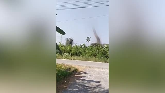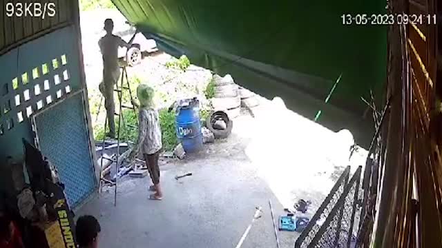 CCTV footage shows the local standing on top of the steps and securing one end of the green roofing when he lost balance, and the structure collapsed with him in Phatthalung, Thailand on May 13. 2024-02-12 11:35:39