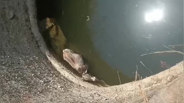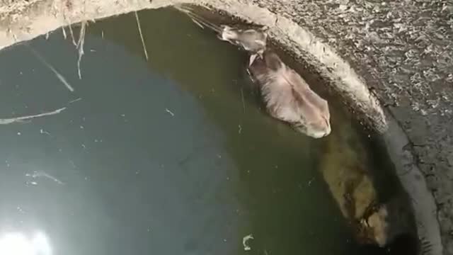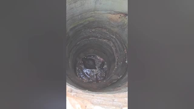 Footage shows the local rapelling down the hole and joined by a neighbour to rescue the bovine wading in the water beneath in Madhya Pradesh on April 26.