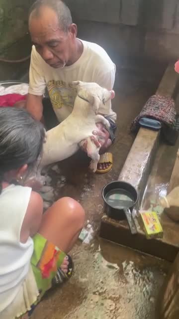 Pet dog has makeshift muzzle for bath time