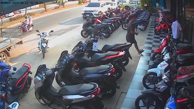 CCTV footage shows the Toyota Corona sedan veering off the road into the BBG Motor secondhand store in Samut Songkhram, Thailand, on April 22. 2024-04-24 15:42:00