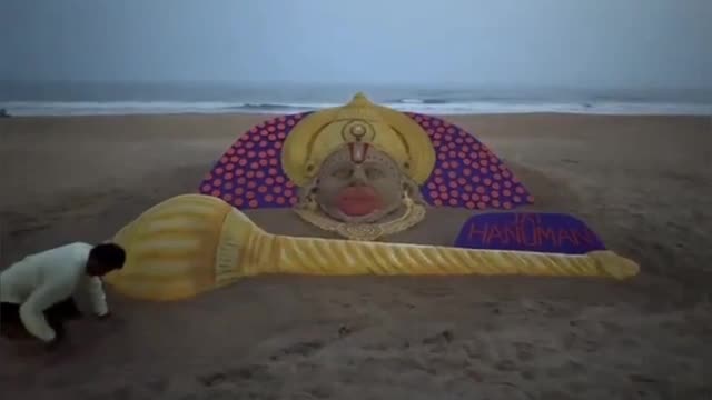 Footage shows Sudarshan Pattnaik adding details to the large coloured sand art depicting Lord Hanuman at the Puri Beach in Odisha to celebrate Hanuman Jayanti on April 23. 2024-04-24 16:01:59