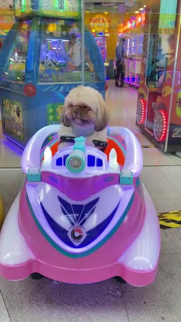 Pet Shih Tzu sits in kiddie toy car ride