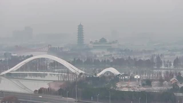 Footage captured by Zhi Fengbin shows the foggy city, and the towering pagoda stands prominently, juxtaposing modern and ancient architectural buildings with a feel of cyberpunk ambiance.