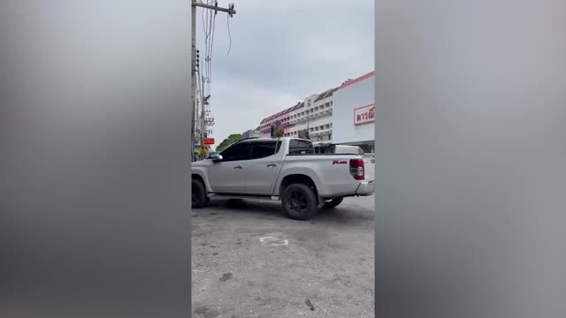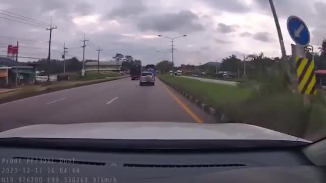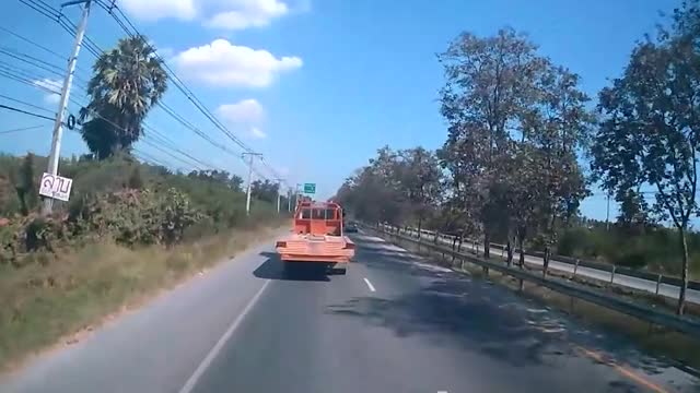 Dashcam footage shows one of the orange eight-wheeler's front tires blowing up and engulfing the vehicle's front part in a cloud of dust in Prachuap Khiri Khan province on December 21.