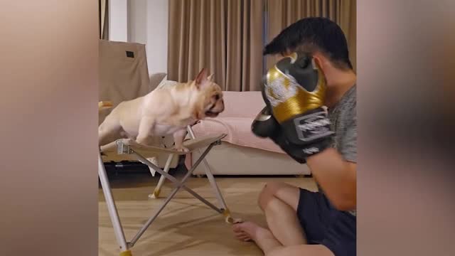 Footage shows the owner playfully pretending to punch at the French Bulldog's face while wearing boxing gloves. Upon seeing this, the Pomeranian pooch barks at its owner in an effort to prevent him from punching at his friend.