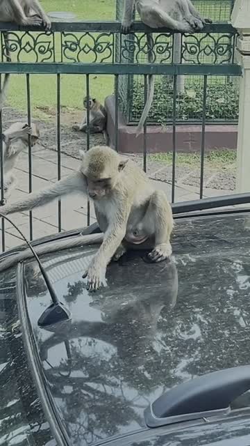 Footage shows the macaque twisting the stick and trying to pull it off from the parked sedan in Lopburi province, Thailand, on April 3.