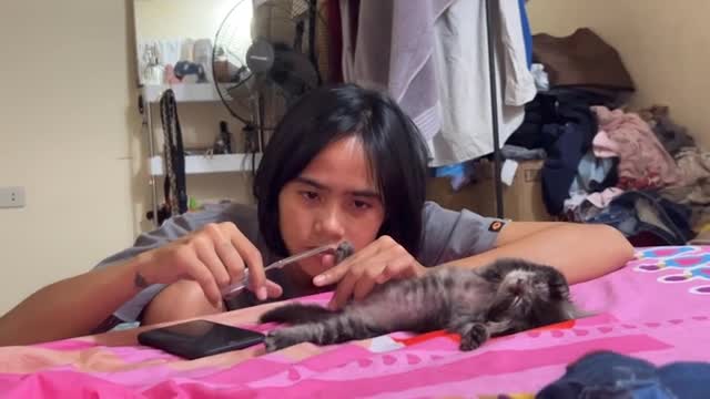 Footage shows Treshia Mae De Jesus grooming the eight-weeks-old feline named Kiwi in their bedroom in Iriga City, the Philippines on April 5.