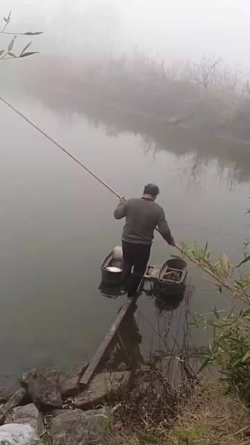 Footage shows Luo climbing aboard the practical vessel made of two plastic containers on either side for buoyancy and paddling forward using a bamboo stick in Hubei province on January 15. 2024-01-25 11:18:39