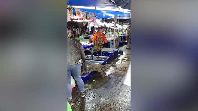 The huge reptile caused chaos when it crawled under the woman's table and took a dip in one of her plastic tubs in Phetchaburi province on April 7. 2024-04-11 12:59:30