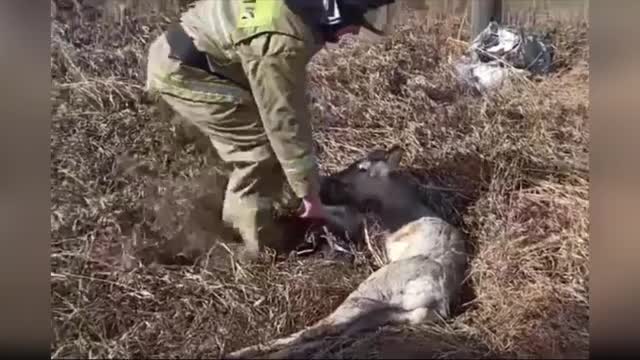 The animal strayed from the forest into the urban area of Sharypovo in the Krasnoyarsk Territory when it became ensnared in railings, prompting a concerned local to alert the search and rescue team. 2024-04-11 12:24:24