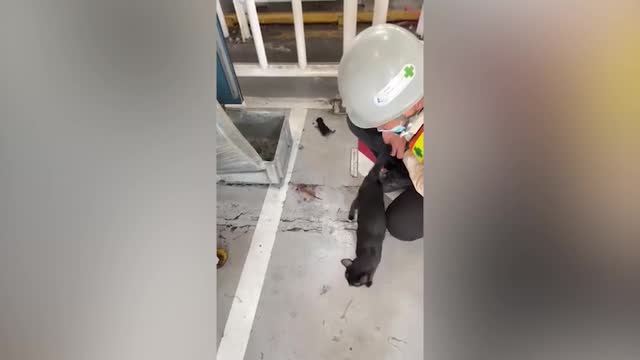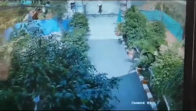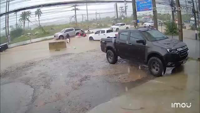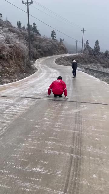 Footage captured by Chai Huaxiang shows two kids skating on a frozen, slippery road coated with ice. One kid tries to balance himself on the frictionless surface but eventually falls into the ditch on the side of the road.