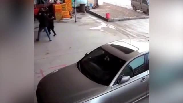 Kid slips over while sliding down icy road in China
