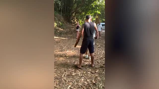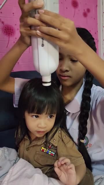 Footage shows the 12-year-old youngster named Sirikwan using a handheld vaccuum cleaner to gather easily her two-year-old sibling Kwansiri's hair in Chonburi province, Thailand on February 26.