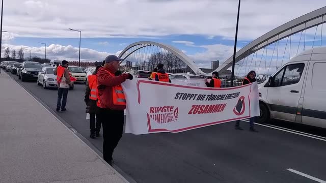 The activists blocked cars on an avenue near Porte Maillot for about thirty minutes. Some activists glued their hands to the ground and chained themselves by the neck while smoke bombs were also lit.
