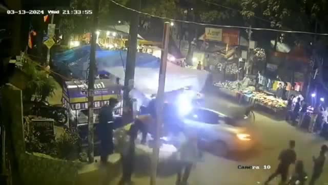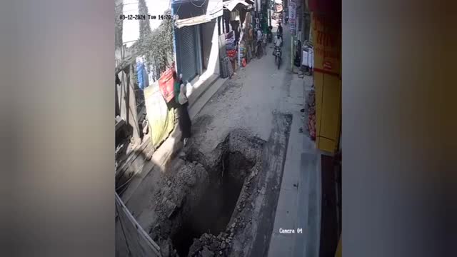 The motorist, who was not wearing a helmet, was negotiating the narrow path while roadworks were being carried out when his foot was caught on the edge of a large hole in the street in Ghazipur, Uttar Pradesh, on March 12.