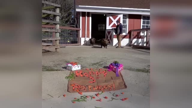 Footage shows the two animals emerging from the shed and making a beeline for a vegetable bouquet arrangement at the Milwaukee County Zoo on April 5. 2024-04-09 12:56:16
