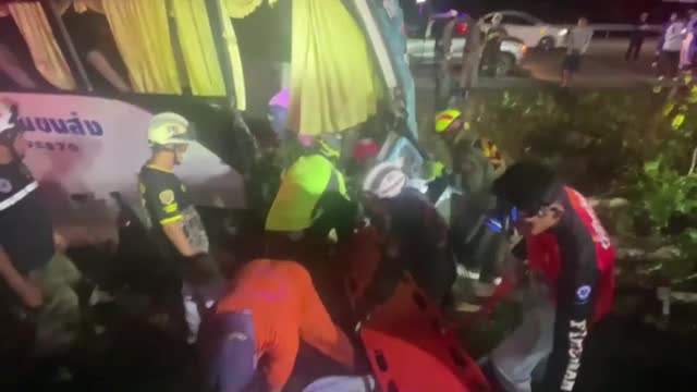 The coach carrying 34 people was heading to Bangkok from Chiang Mai when it skidded off Phahonyothin Road and smashed into a tree in Lampang province on May 7 evening. 2024-05-10 15:40:53