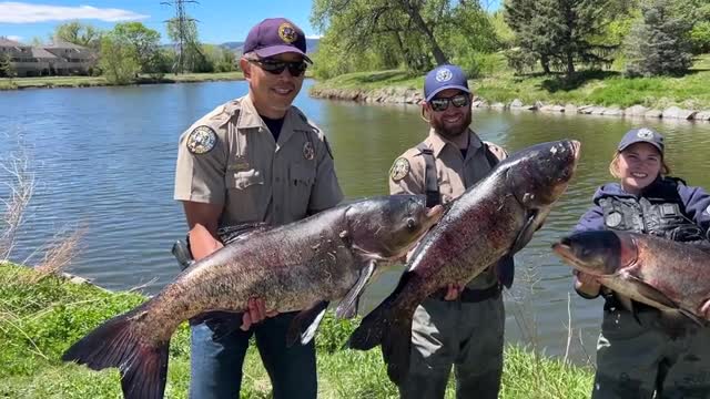 Footage shows the Colorado Parks and Wildlife holding some of the 14 bighead carp that they captured in Jack B Tomlinson Park pond in Arvada on May 15. 2024-05-17 16:27:18