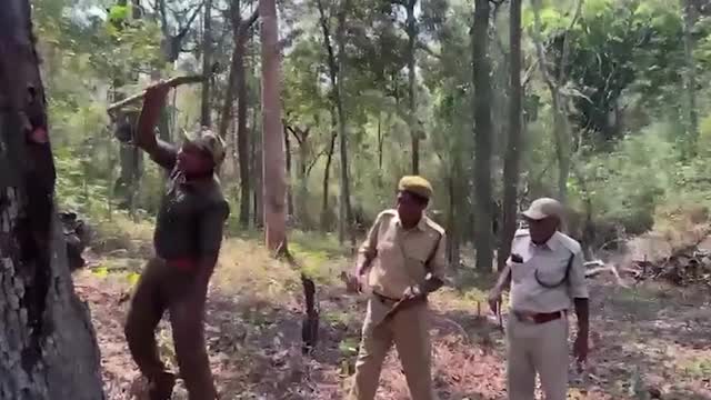 Footage shows officers hacking into the Terminalia tomentosa tree, also known as the Indian laurel or crocodile bark tree, at the Papikonda National Park in Andhra Pradesh on March 30. 2024-04-04 18:50:22