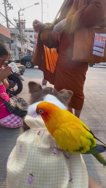 Footage shows the three-year-old sun conure named Sunny perched on the back of its Chihuahua friend named Dolly in front of the orange-robed man in Bangkok, Thailand on April 1.