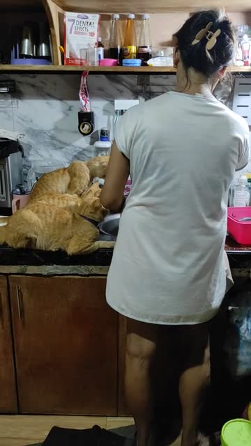 Footage shows the ginger moggies named Tiger, Tisoy, and Bibimbap sitting beside the sink as their owner Maribeth Bonaobra cleaned the fish to cook in Caloocan City, the Philippines on March 29.