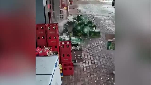 This is the dramatic moment dozens of beer bottles are smashed to piecesafter thick icicles from the drain pipe above the crates come crashing down. 2024-02-23 09:43:12