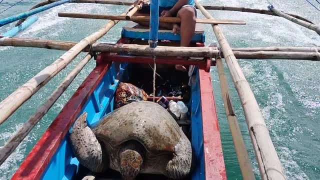 Fishermen Roberto G. Delima and Teofisto Belmonte release the huge sea turtle near a Marine Protected Area in Sorsogon, the Philippines, on November 15. 2025-11-15 03:45:00